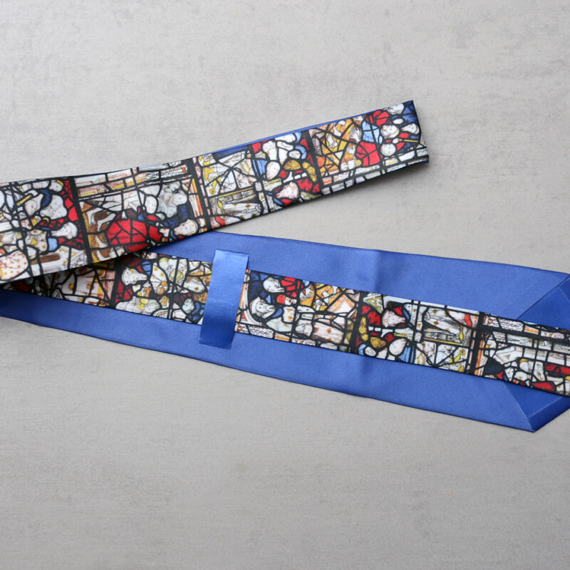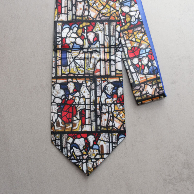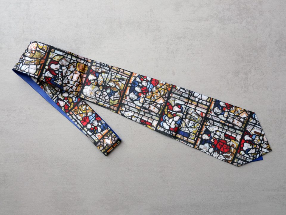 Bespoke, hand crafted All Saints North Street tie, showing various scenes from the stained glass windows of All Saints.