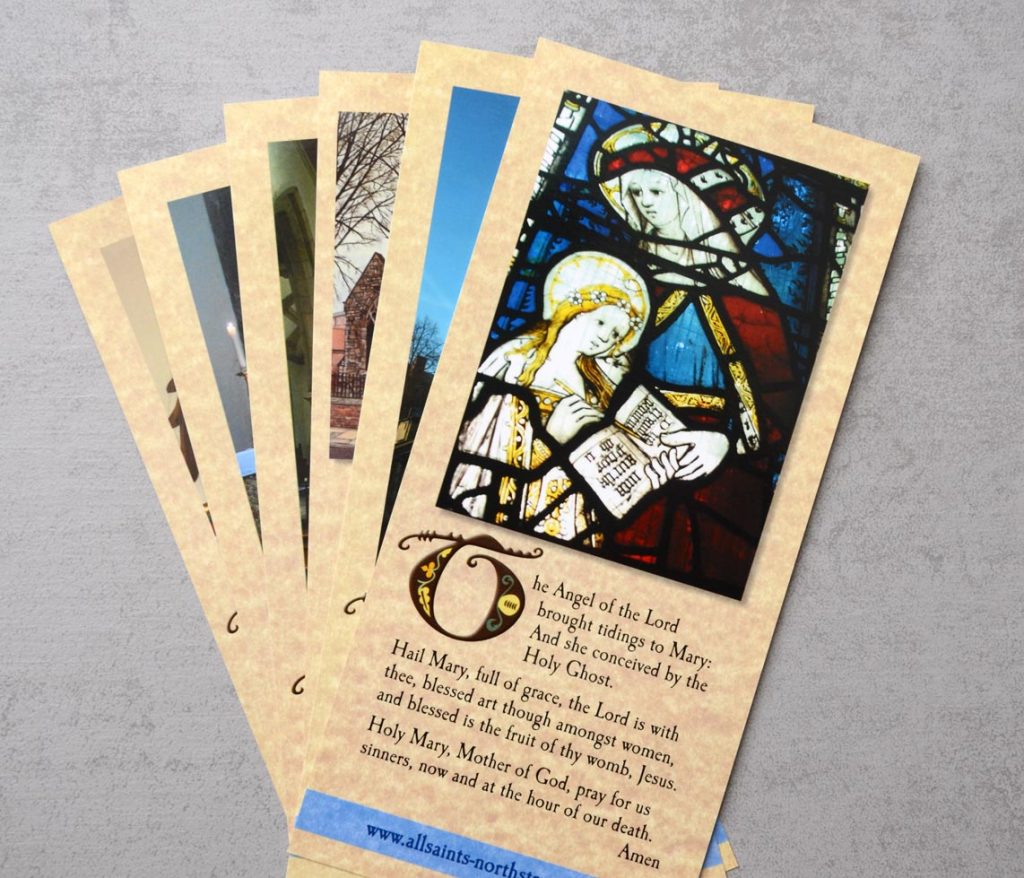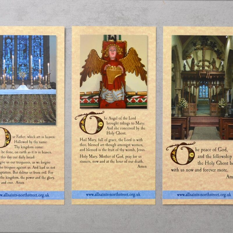 The All Saints bookmark / prayer cards are printed on card, laminated and in full colour, with a plain white reverse side.